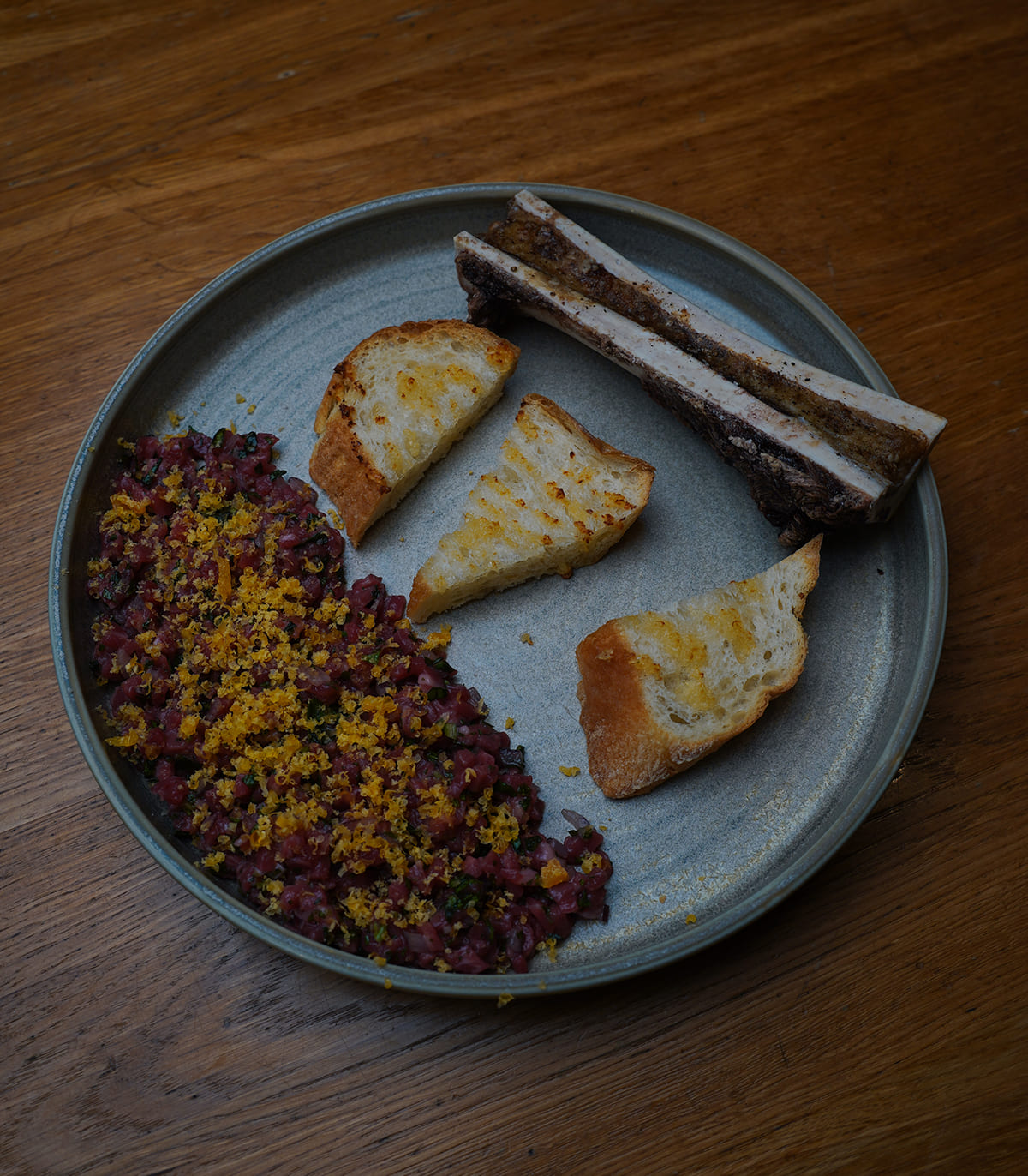 Мраморная говядина, лук красный, петрушка, базилик, мята, масло оливковое, вяленый желток, мозговая косточка, чиабатта
