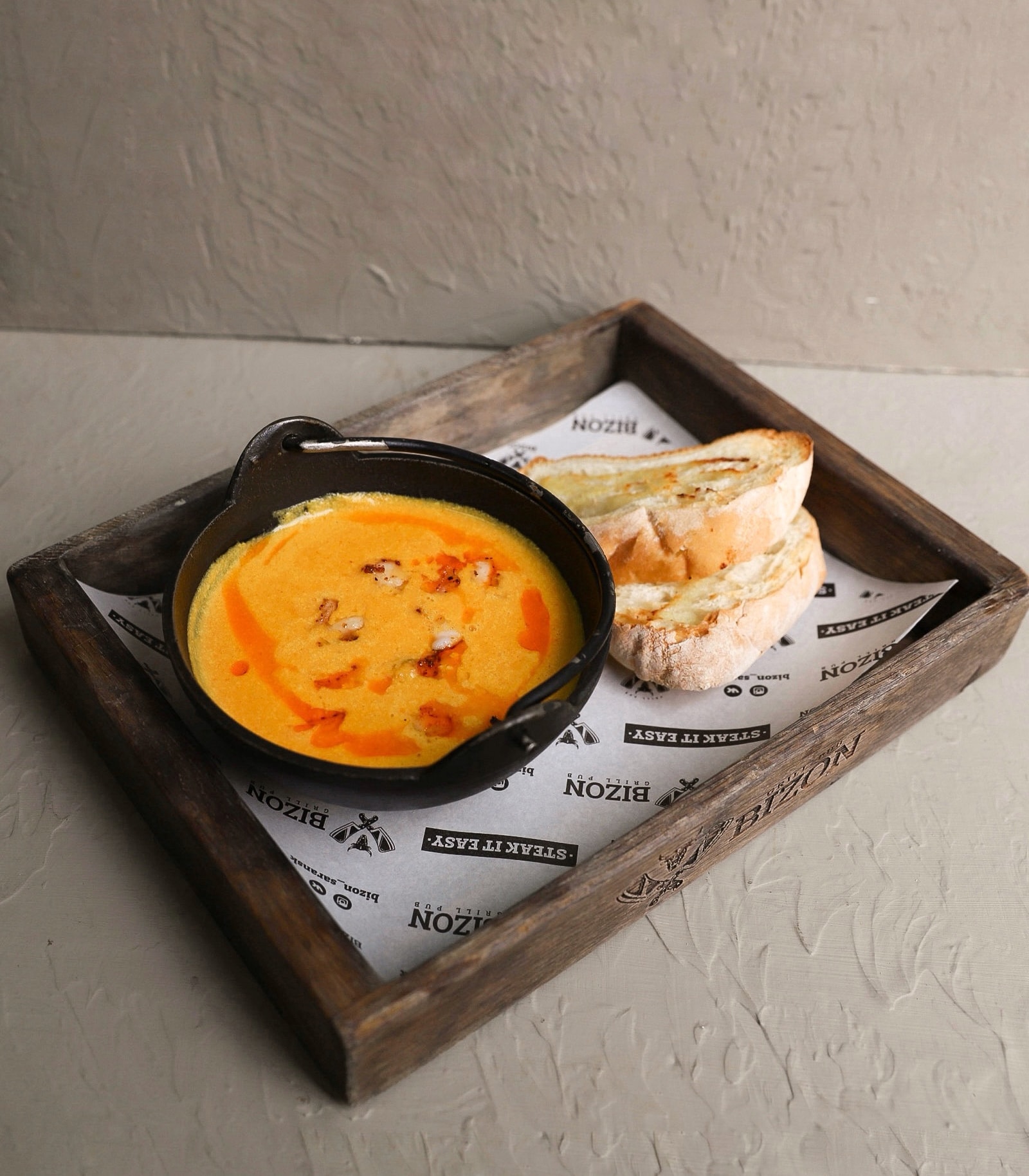 Тыквенное пюре,кокосовое молоко,паста том ям,жареные креветки,чиабатта