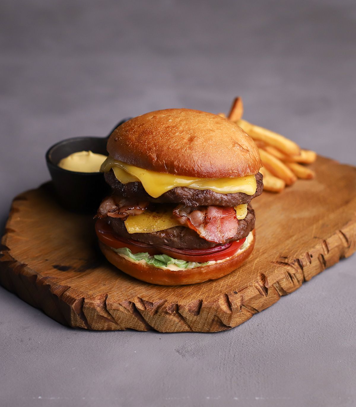 Две котлеты из говядины, соус , бекон, салат, томат, сыр чеддер, красный лук, картофель фри, соус сырный.