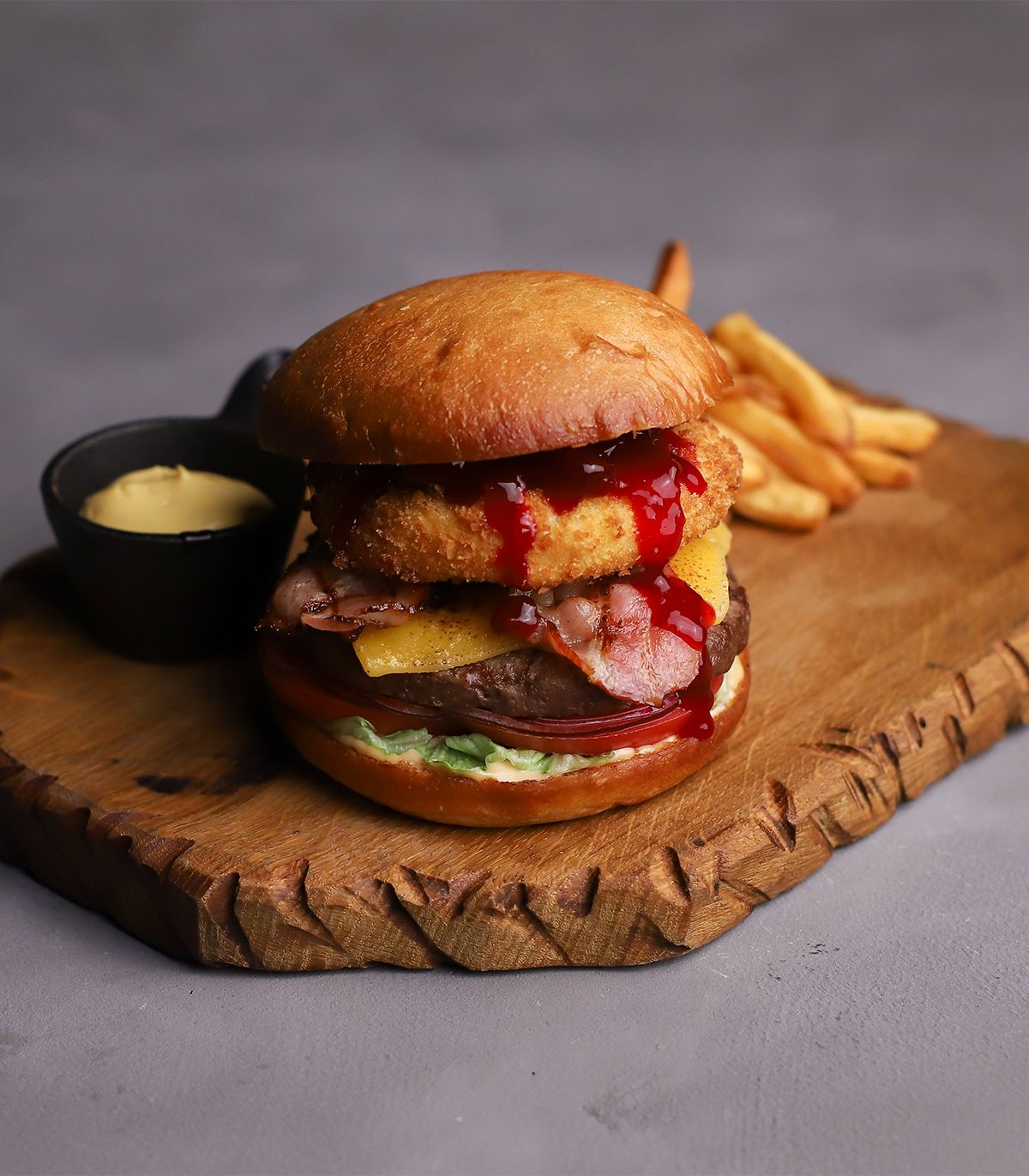 Котлета из говядины, сыр камамбер , соус сырный, соус вишневый, сыр чедер, бекон, картофель фри.