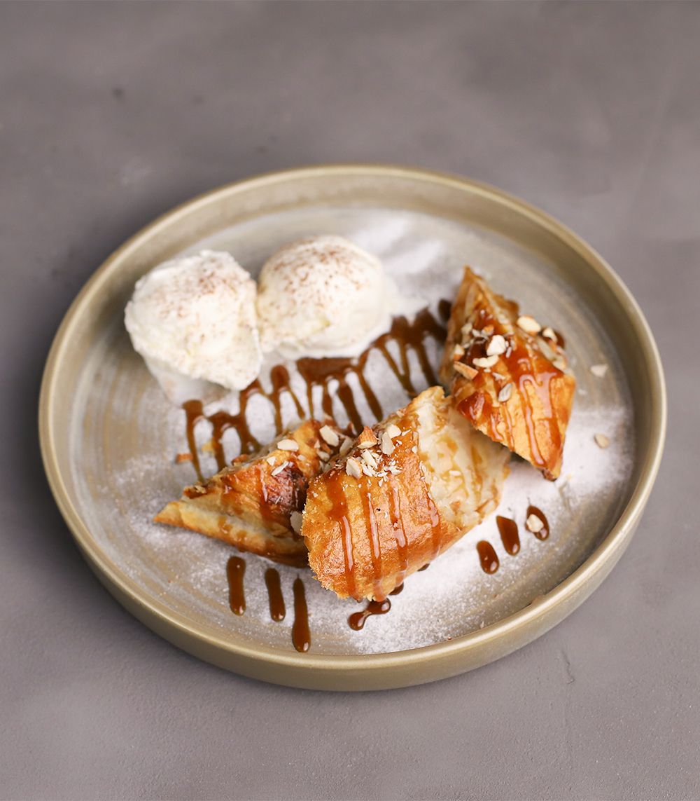 Слоеное тесто, яблоки, корица, сливочный пломбир, грецкий орех, карамель.