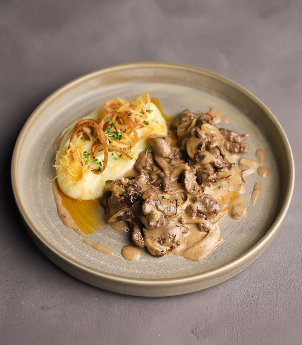 Мраморная говядина, сливочный соус, шампиньоны, лучок, картофельное пюре с сыром чеддер и луком фри.
