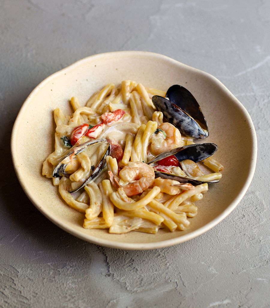 Креветки тигровые, мидии голубые, филе кальмара, лук, чеснок, белое вино, тимьян, базилик, сливки.