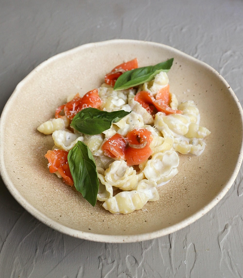 Паста гноччи, камамбер, горгонзола, копченый сулугуни, пармезан, сливки, базелик, лосось