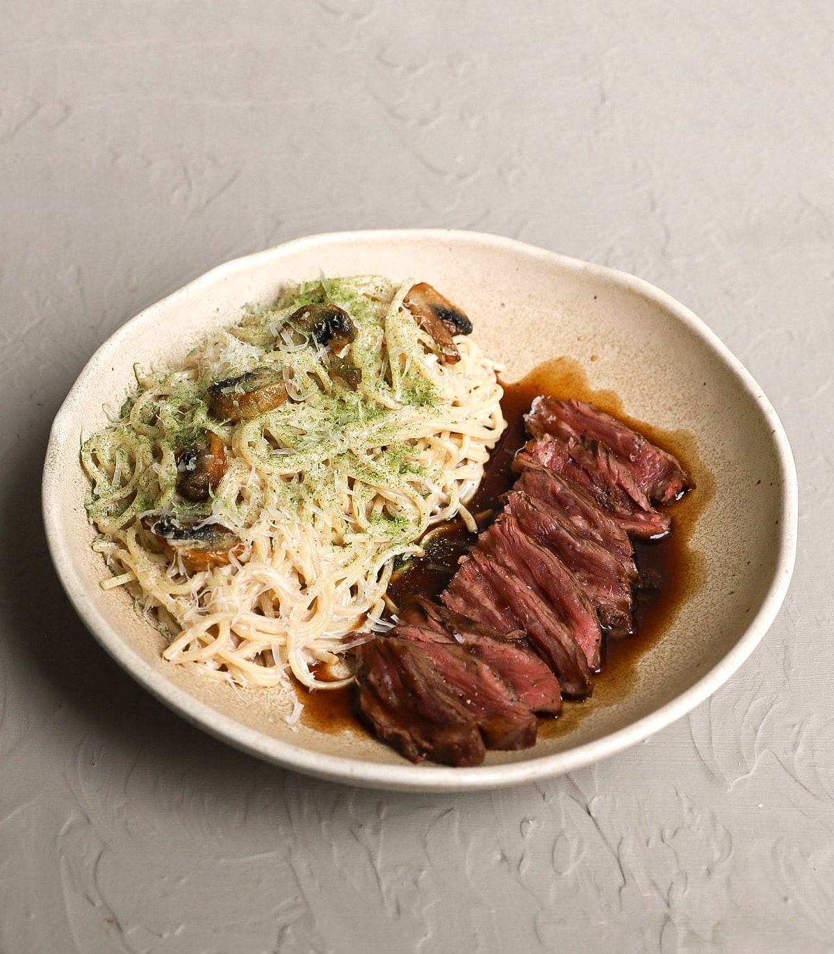 Спагетти,шампиньоны,стейк мясника,гранатовая глазурь,пармезан,сливки