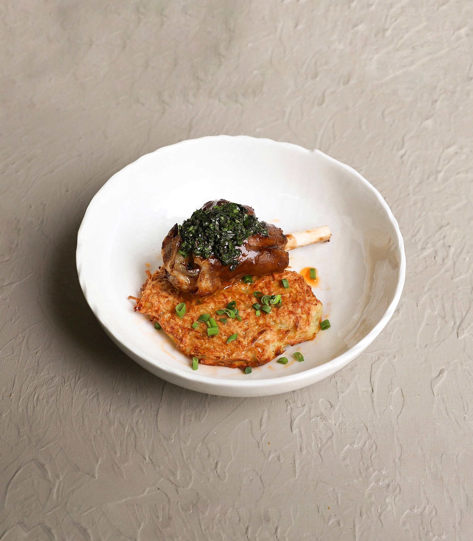 Ножка ягненка,картофельный драник,гранатовая глазурь,чимирури