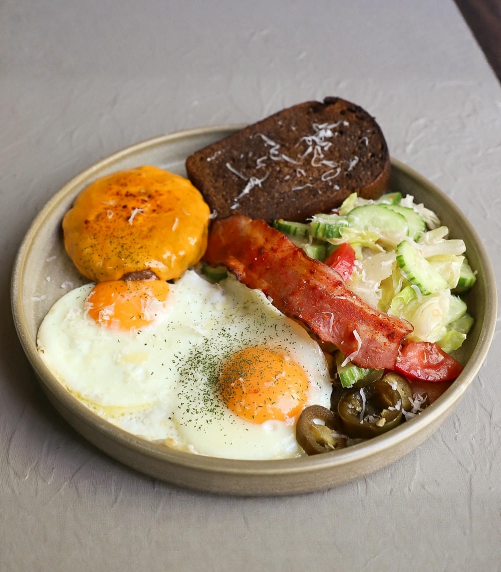 Котлета из мраморной говядины, сыр чеддер, пармезан, сладкий бекон, айсберг, романо, огурец, томаты, глазунья, медовый соус, халапеньо