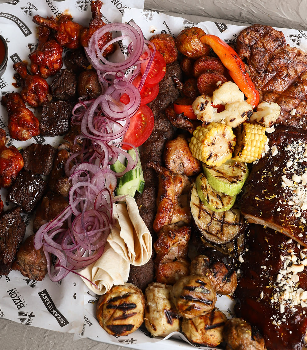 Шашлык из свиной шейки, шашлык из мраморной говядины, шашлык из мякоти куриного бедра, куриные крылышки шрирача, свиные ребра Кимчи, люля кебаб из говядины, овощи на гриле, шампиньоны на гриле, пряный картофель бейби, свежие овощи, морковь по - корейски, лаваш, соус томатный, соус перечный, соум тар - тар, соус BBQ.