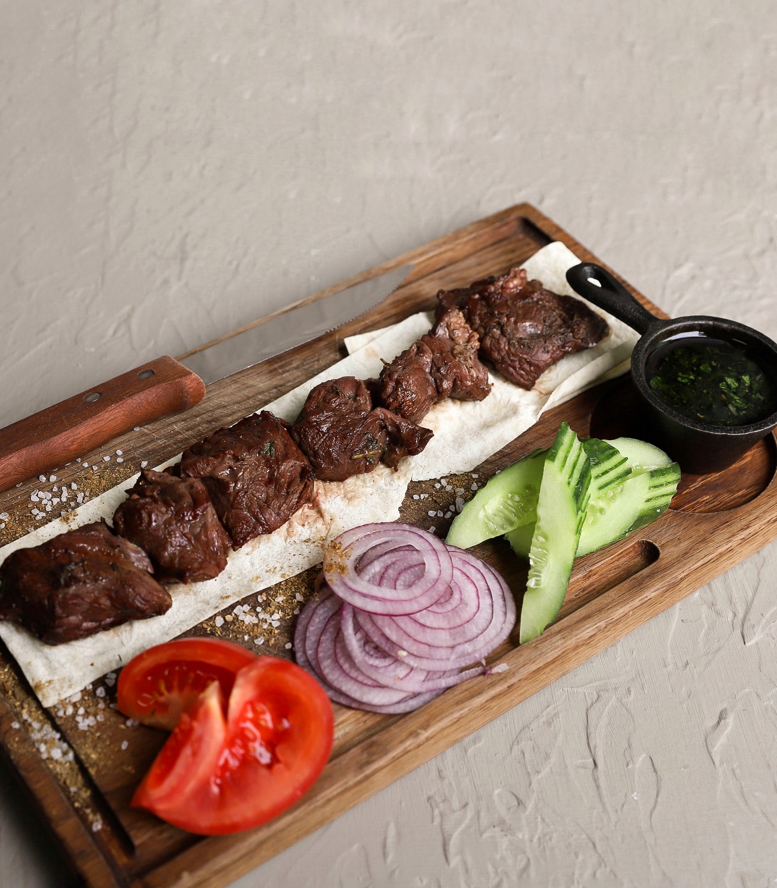 Гранатовая глазурь, лук красный, свежие томаты, огурец, лаваш, соус чимичюри.