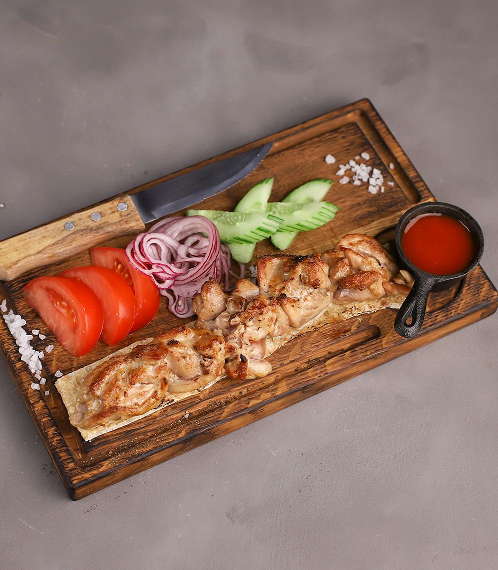 Лук красный, свежие томаты, огурец, лаваш, соус томатный с базиликом.
