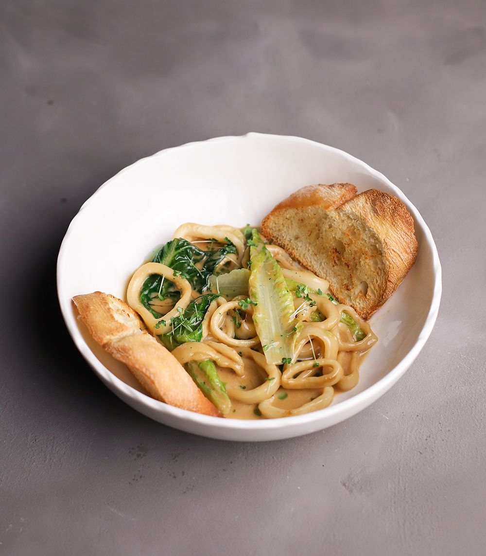 Соус унаги, сливки, чеснок, зеленое масло, чиабатта.