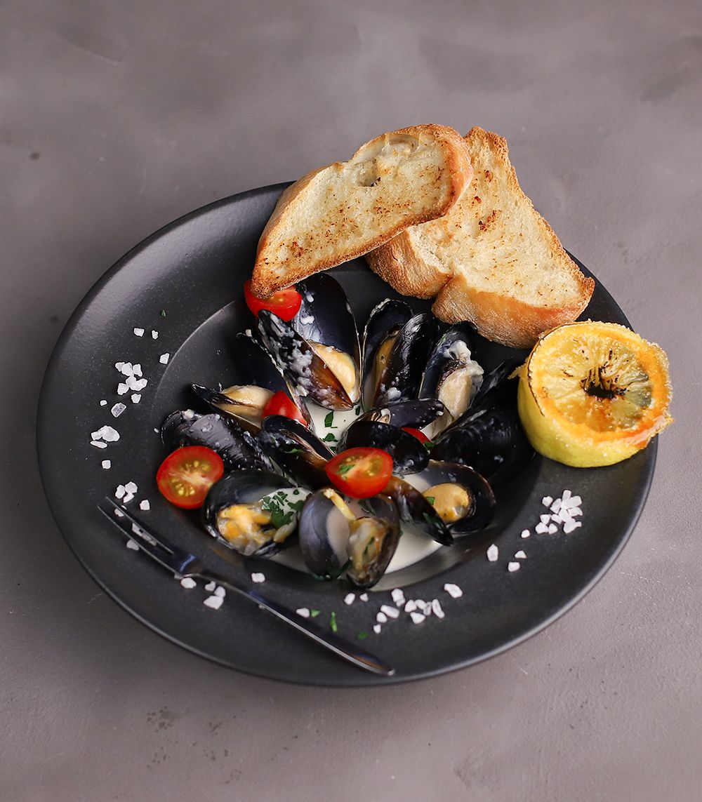 Сыр горгонзола, сливки, чеснок, петрушка, белое вино, чиабатта, черри, лимон.