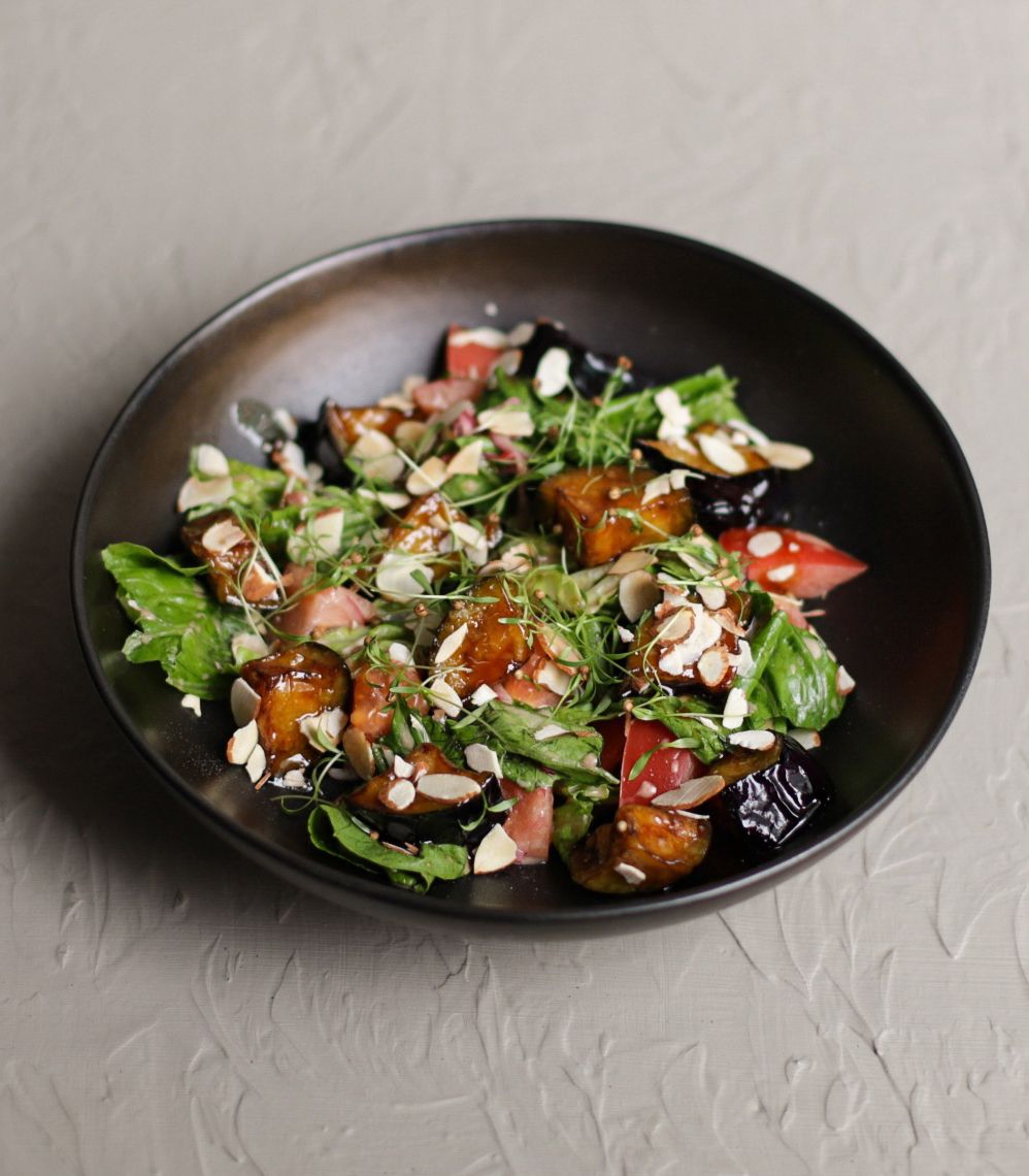 Розовые томаты, салат Романо, красный лук, миндальные лепестки, зелень, соус чили сладкий, восточный соус.