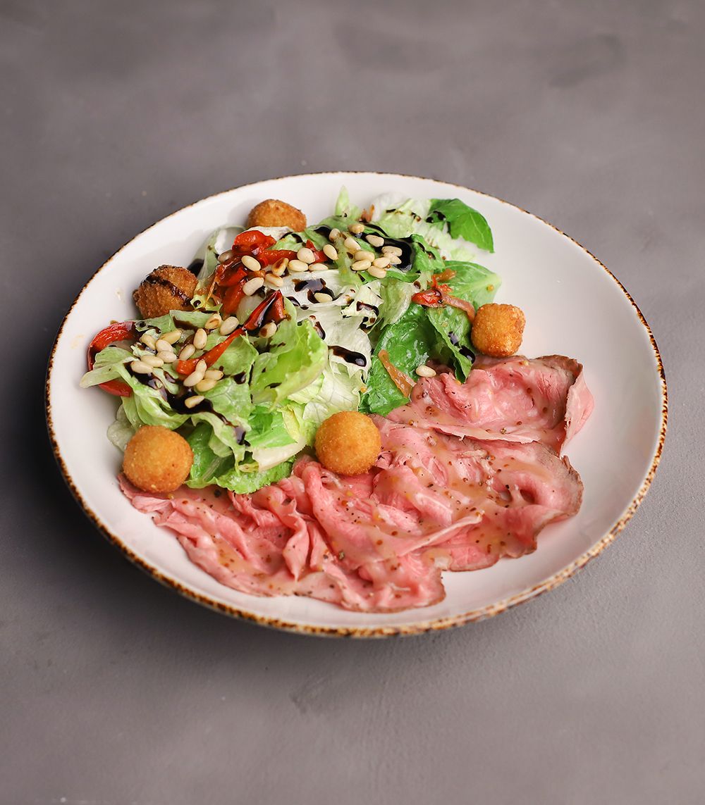 Ростбиф, перечное рагу, сыр чеддер, микс салатов, кедровые орешки, соус медовый, бальзамик кофейный.