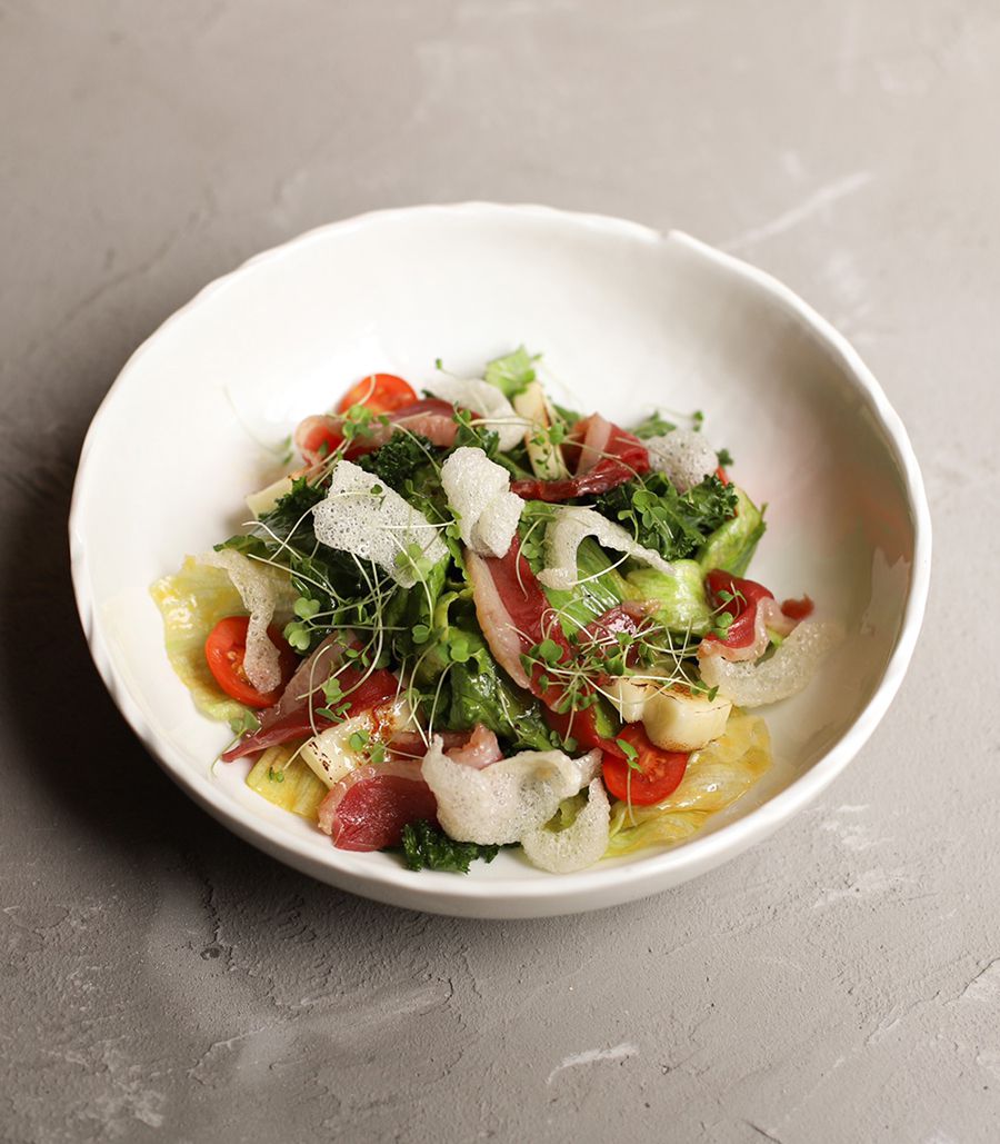 Cалатный микс, томаты чери, сыр халуми, соус манго-лайм