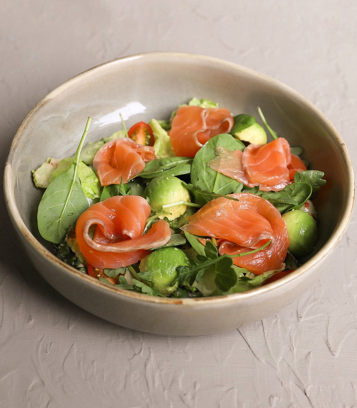 Микс салатов,руккола,шпинат,авокадо,черри,огурец свежий,слабосоленый лосось