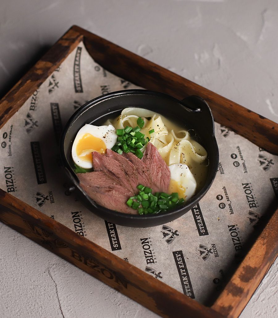 Томленая говядина, яйцо куриное, салат Рамано, бульон, фетучини, лук зеленый.