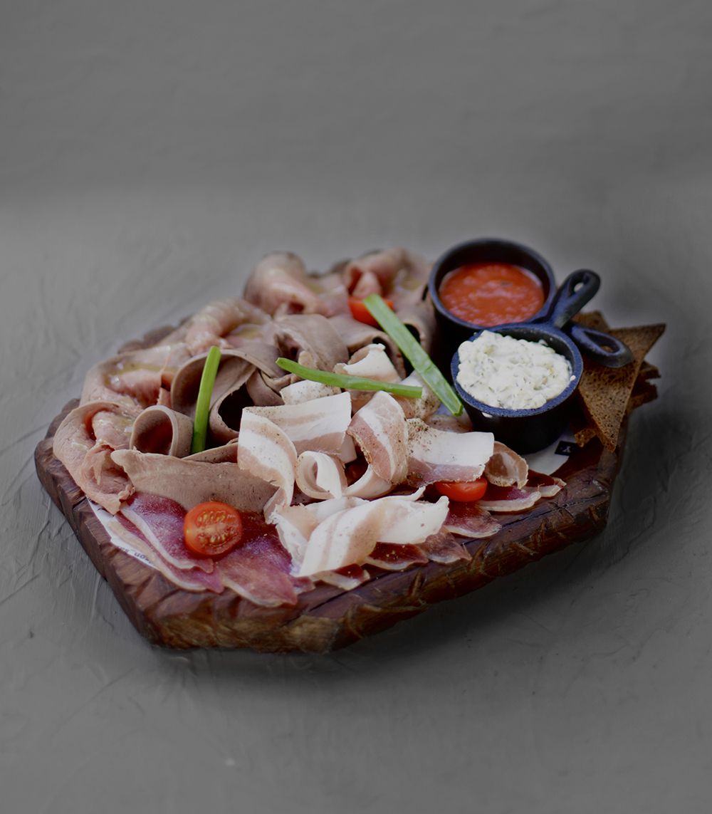 Язык томленый, ростбиф, утка с/в, соленое сальце, соусы томатный с базиликом и тар-тар, гренки из бородинского хлеба.