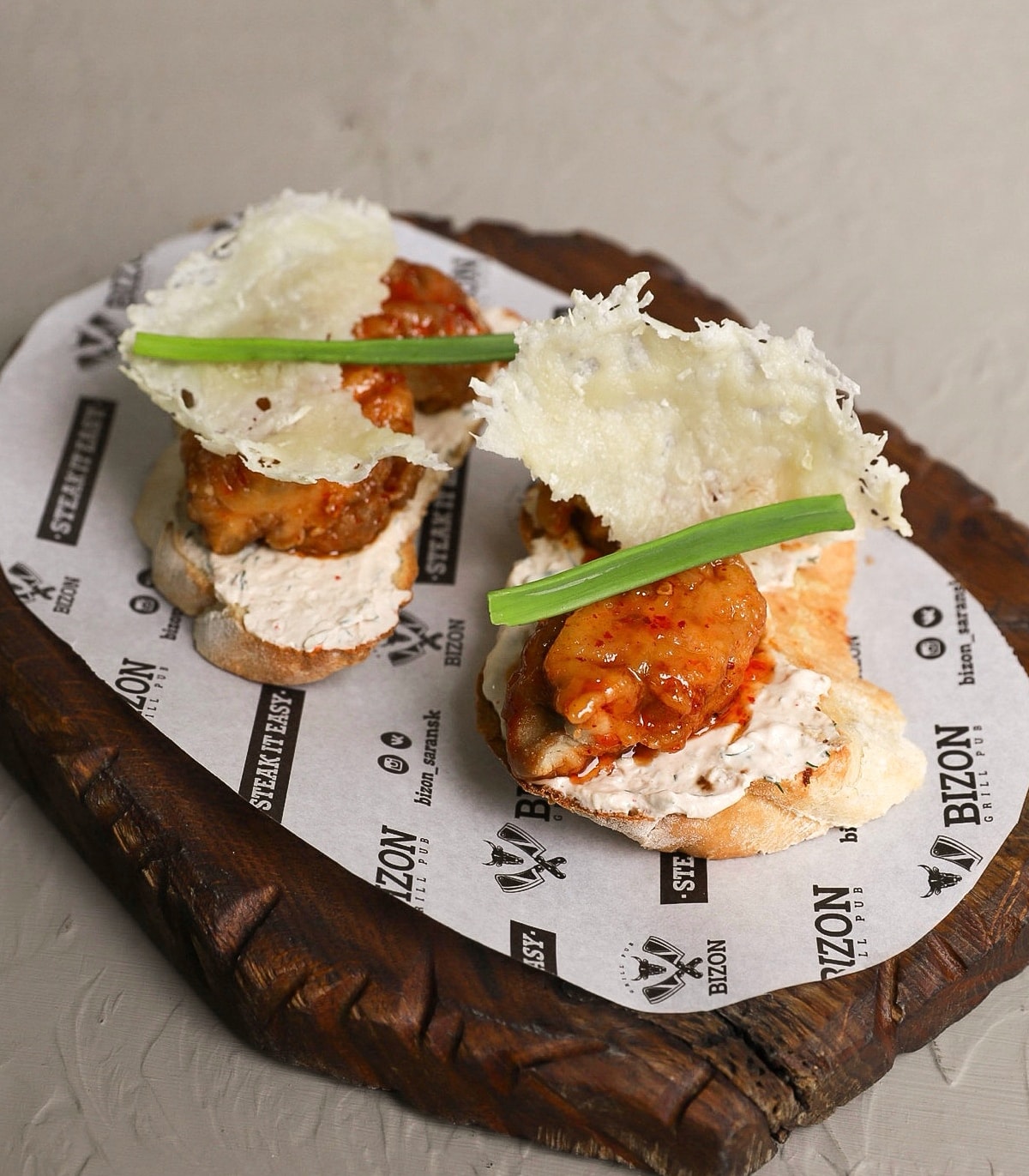Чиабатта,крем сметана-чиз,хрустящий мозг телёнка,чипсы из пармезана