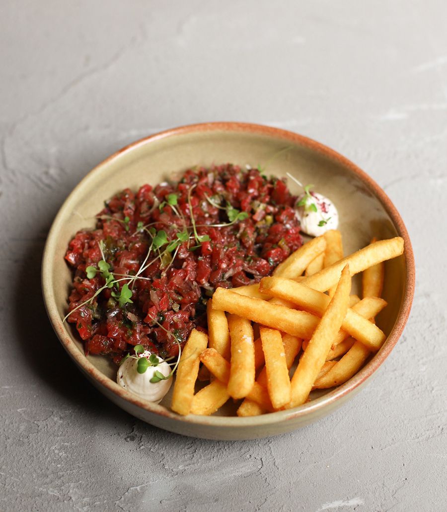 Красный лук, халапеньо, мусс сулугуни, картофель фри, зелень.