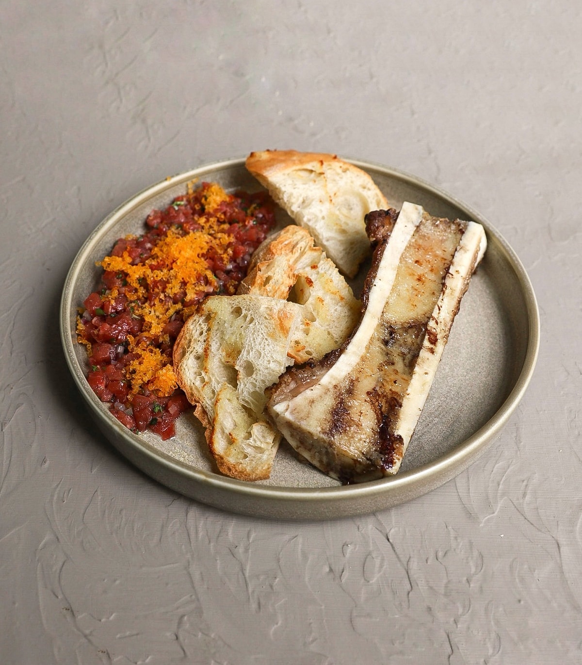 Мраморная говядина, лук красный, петрушка, базилик ,мята , масло оливковое, вяленый желток,мозговая косточка, чиабатта