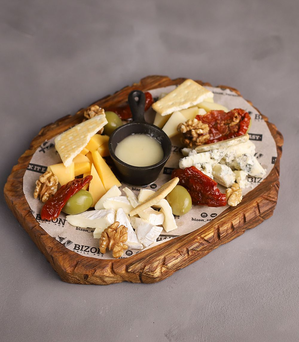Сыры: пармезан, камамбер, горгондзола, чеддер, оливки, вяленые томаты, грецкий орех, мед.
